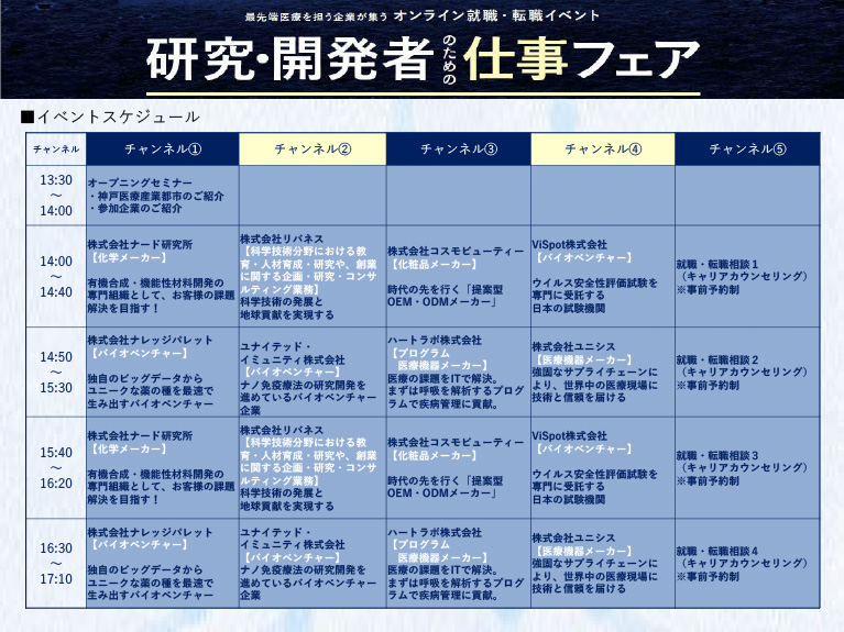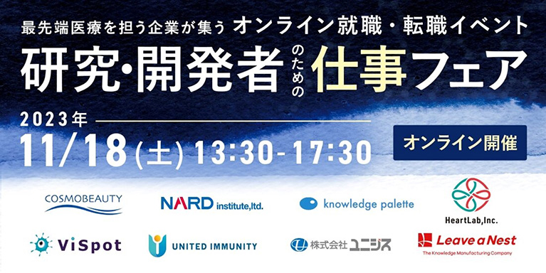 神戸医療産業都市(KBIC)では、2023年11月18日にオンライン就職・転職イベント「研究・開発者のための仕事フェア」を開催。4回目となる今回は、KBIC進出企業から8社が出展し、現在研究職として活躍されている方から大学生の方まで、全国から約40名が参加しました。